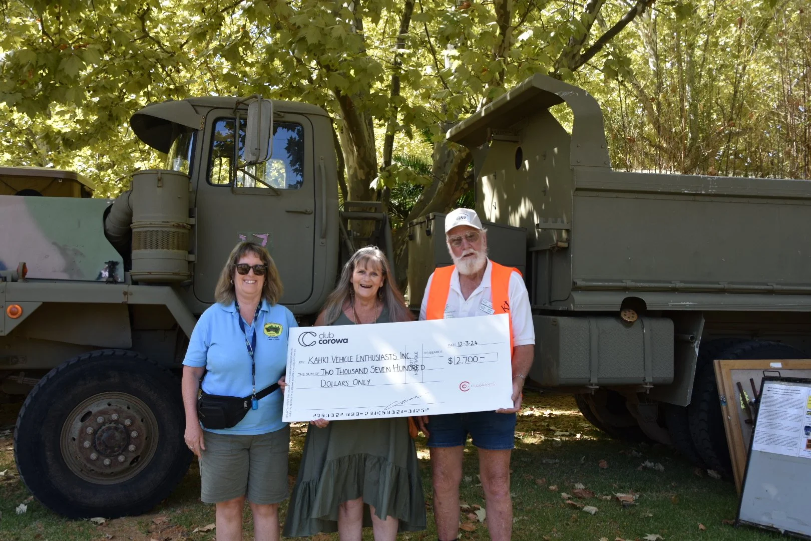 Club Corowa recently provided $2,700 to the Khaki Vehicle Enthusiasts Inc (KVE) to support their 44th Annual Corowa Swim-In and Military Vehicle Gathering.
